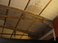 Im Focus - vier Blickpunkte Der erste Blickpunkt: Die Deckentapete im Mythologischen Saal, von 1845 Der Blick entlang der Längsachse des Mythologischen Saals fällt auf den Pharao: die Beterfigur des Königs Amenemhet III., 12. Dynastie, um 1840–1800 v.Chr., aus Granit, Höhe 200 cm, Memphis. Das altägyptische Herrscherbildnis ist ein Zeugnis der in der Weltgeschichte einzigartigen politischen Stabilität des Pharaonenreiches. Tradition hatte einen hohen Stellenwert, und so blieb die Herrschaftsform über Jahrhunderte stabil, ebenso wie Gewänder und Schmuck der Pharaonen kaum Veränderung erfuhren. Die Kronen von Oberund Unterägypten sowie das Königskopftuch (ägypt. nemes) zeichnen den Herrscher durch alle Epochen aus. Die aufgebäumte Uräusschlange an der Stirn jedes Mitglieds der Königsfamilie signalisiert die Unnahbarkeit und Unverletzlichkeit des Königshauses. Die charakteristische Tracht des Königs ist der kurze plissierte Schurz (ägypt. schendschut). Trotz aller Traditionstreue lässt jede Statue den Menschen erkennen, der Geschichte gestaltet. Der ägyptische König ist nicht Gott, sondern Mensch – ein besonderer Mensch allerdings. In betender oder opfernder Haltung dargestellt, wird seine Rolle als Vermittler zwischen Mensch und Gott betont.